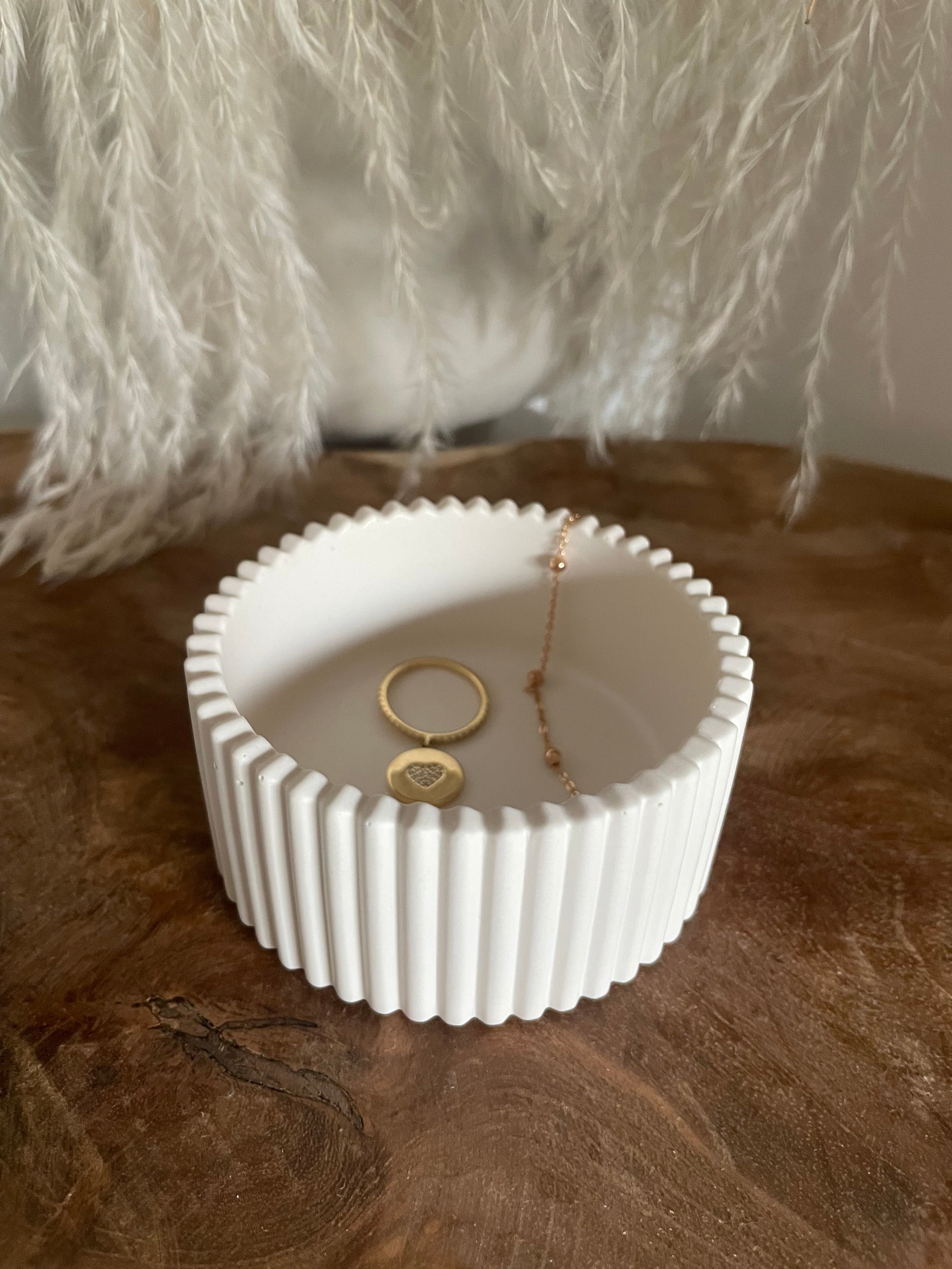 Ce pot rond cannelé en jesmonite séduit par son design élégant et intemporel. Sa forme circulaire, rehaussée de fines cannelures régulières, apporte une touche décorative raffinée qui capte joliment la lumière.